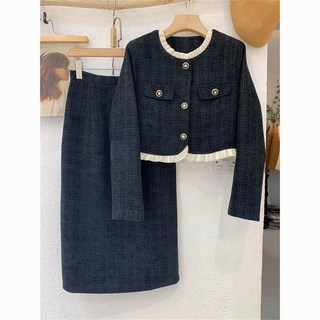여성 소향풍 세트 캐주얼 봄 가을 긴팔 트위드 자켓 + 하이웨이스트 H라인 롱 스커트 상하의 투피스 기질 소향풍 트위드 투피스 세트 MJS